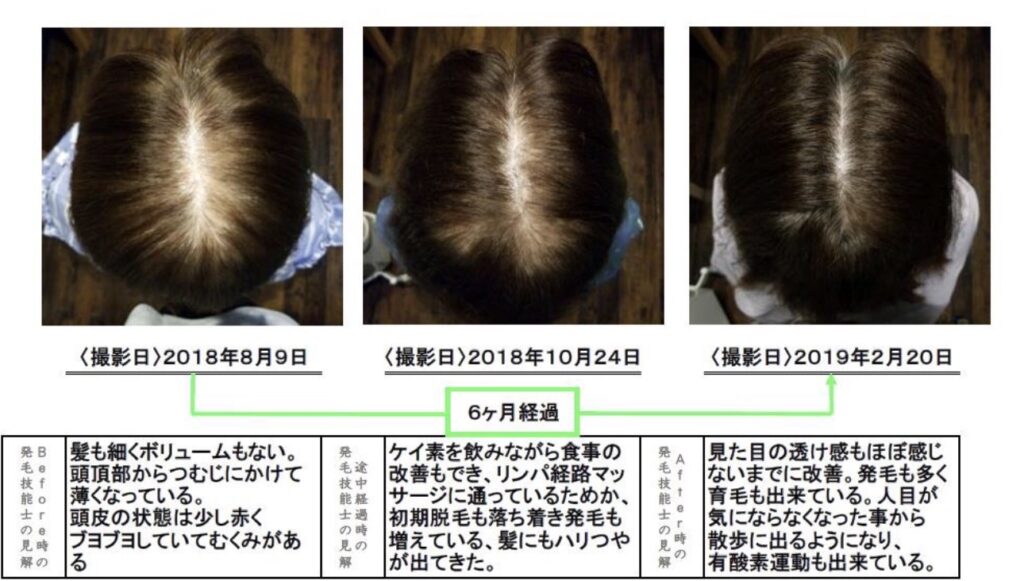 今回は、薬を一切使わずに6ヶ月で見事に髪が増えた50代女性の症例をご紹介します。