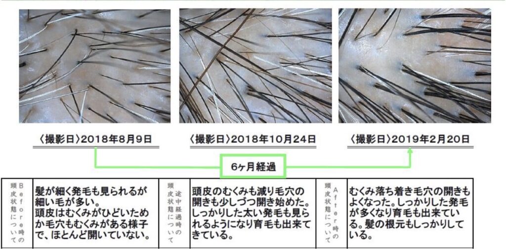 - 発毛・育毛ともにしっかりと確認でき、根元から立ち上がりが見られるまでに改善。