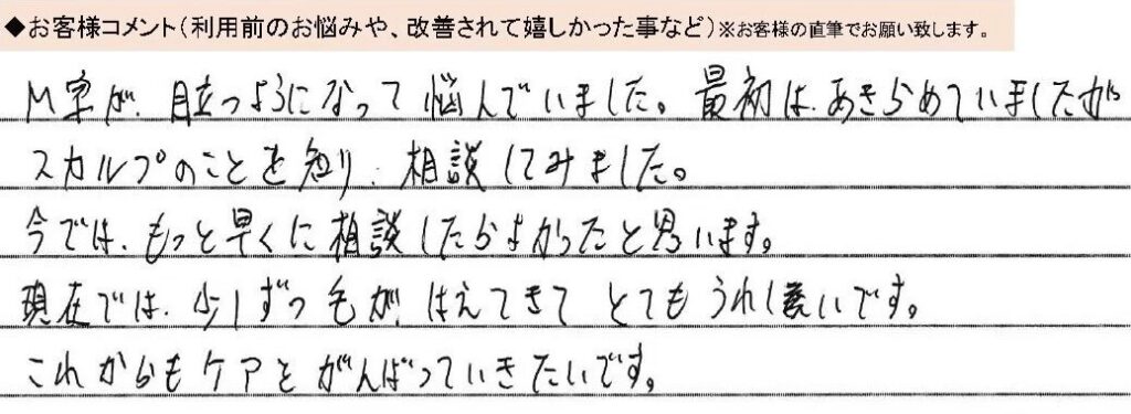 本日は、 30代男性のお客様の発毛経過と、直筆のご感想 を紹介します。