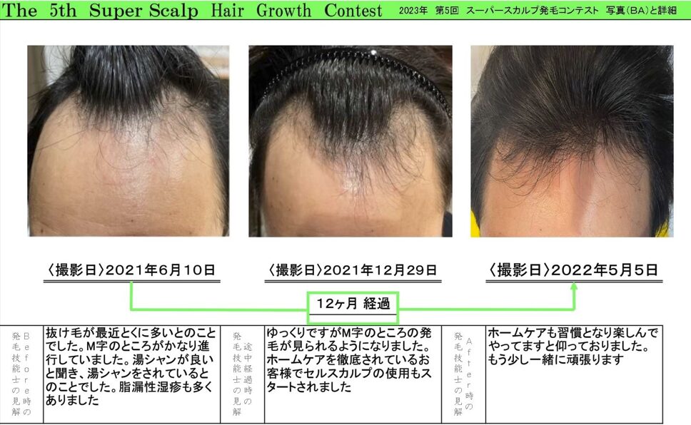 「第5回 スーパースカルプ発毛コンテスト」 にエントリーした実際のお客様の経過で、薬を使わずにホームケアと頭皮環境づくりに取り組まれたケースです。